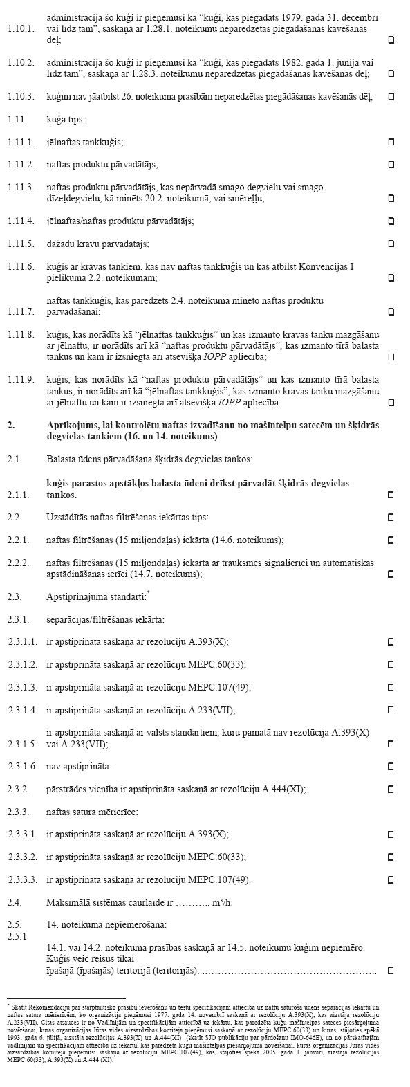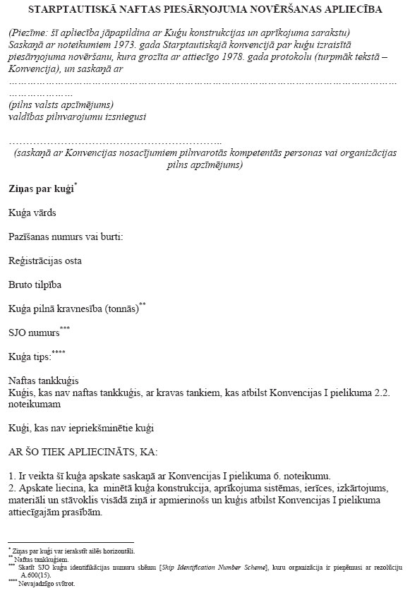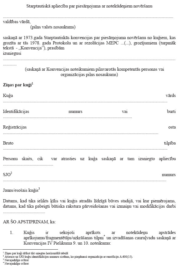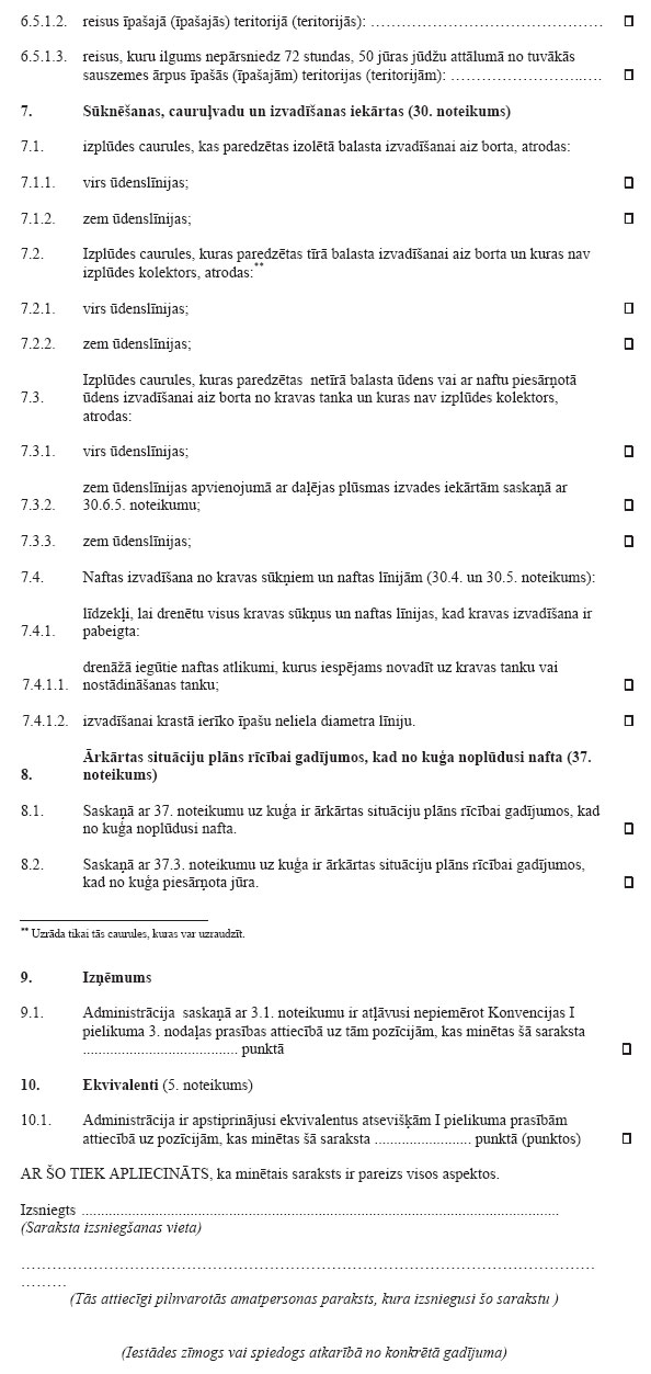 2. Kad kuģis, kam saskaņā ar noteikumiem ir jābūt apliecībai, atrodas kādas Puses jurisdikcijā esošā ostā vai terminālā atklātā jūrā, to pārbauda šīs Puses attiecīgi pilnvarotas amatpersonas. Šajā pārbaudē pārliecinās tikai par to, vai uz kuģa ir derīga apliecība, ja vien nav pamatota iemesla uzskatīt, ka konkrētā kuģa vai tā aprīkojuma stāvoklis būtiski atšķiras no apliecībā minētās informācijas. Šādā gadījumā vai arī tad, ja uz kuģa nav derīgas apliecības, Puse, kas kuģi pārbauda, veic pasākumus, kas nodrošinātu to, ka minētais kuģis neiziet jūrā līdz brīdim, kad tas to var darīt, neradot nepamatoti lielus kaitējuma draudus jūras videi. Taču šī Puse drīkst atļaut kuģim atstāt ostu vai terminālu atklātā jūrā, lai tas varētu turpināt ceļu uz tuvāko pieejamo attiecīgo remonta rūpnīcu.