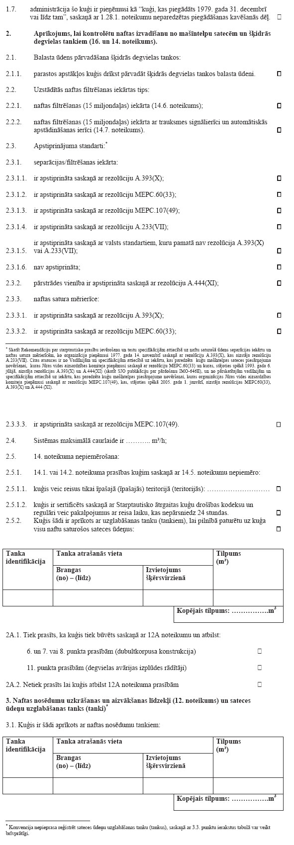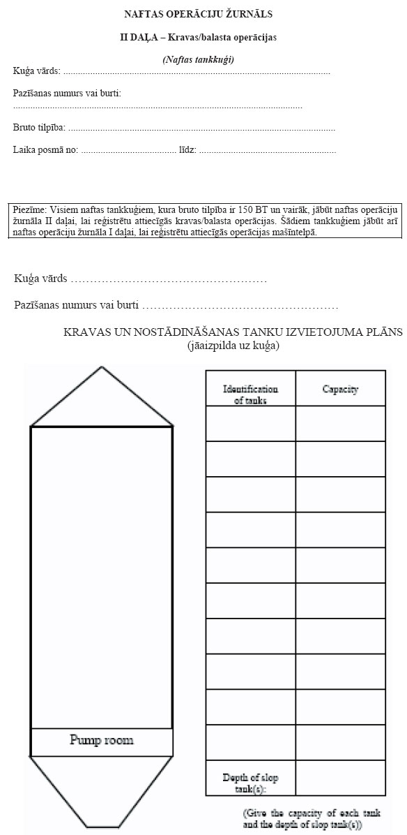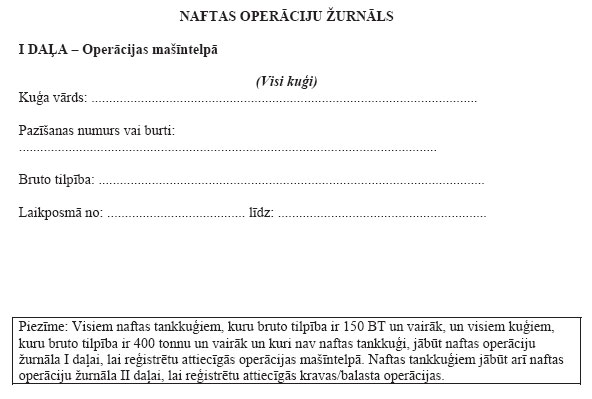 3. Visiem kuģiem, kuru bruto tilpība ir 400 BT un vairāk, un visiem kuģiem, kuri ir sertificēti pārvadāt 15 personas un vairāk un kuri veic reisus uz ostām vai termināliem atklātā jūrā, kas atrodas citu šīs konvencijas Pušu jurisdikcijā, un visām stacionārajām vai peldošajām platformām, ar kuru palīdzību veic jūras dibena izpēti un ekspluatāciju, jābūt atkritumu reģistrācijas žurnālam. Atkritumu reģistrācijas žurnālu, kas var būt iekļauts kuģa oficiālajā žurnālā vai kā citādi, veido saskaņā ar paraugu, kas ievietots šā pielikuma papildinājumā;