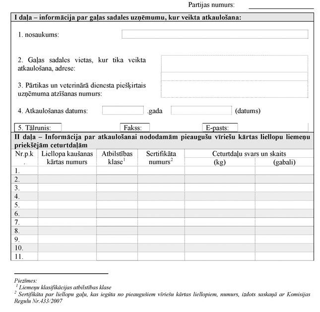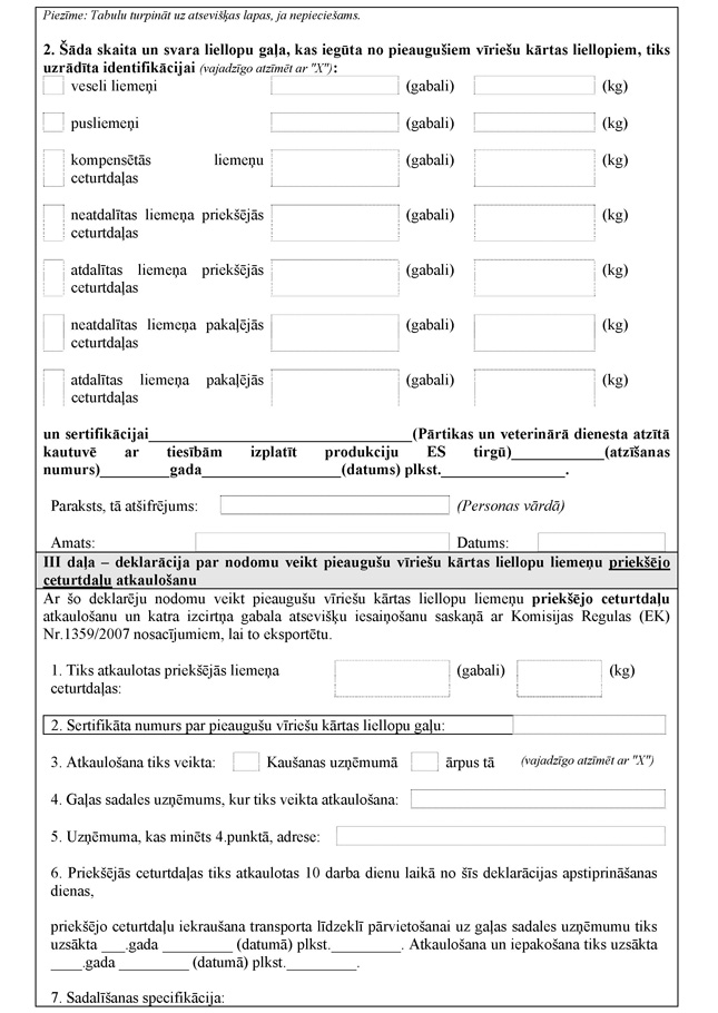 "49. Pieaugušu vīriešu kārtas liellopu gaļa iegūstama no dzīvniekiem, kas nokauti kautuvē un sadalīti Pārtikas un veterinārā dienesta atzītā sadales uzņēmumā, kuram ir tiesības izplatīt produkciju Eiropas Savienības tirgū. Kautuve ir aprīkota ar iekārtu dzīvu dzīvnieku svēršanai, un tajā tiek veikta liellopu liemeņu klasifikācijas uzraudzība atbilstoši normatīvajos aktos noteiktajām prasībām."