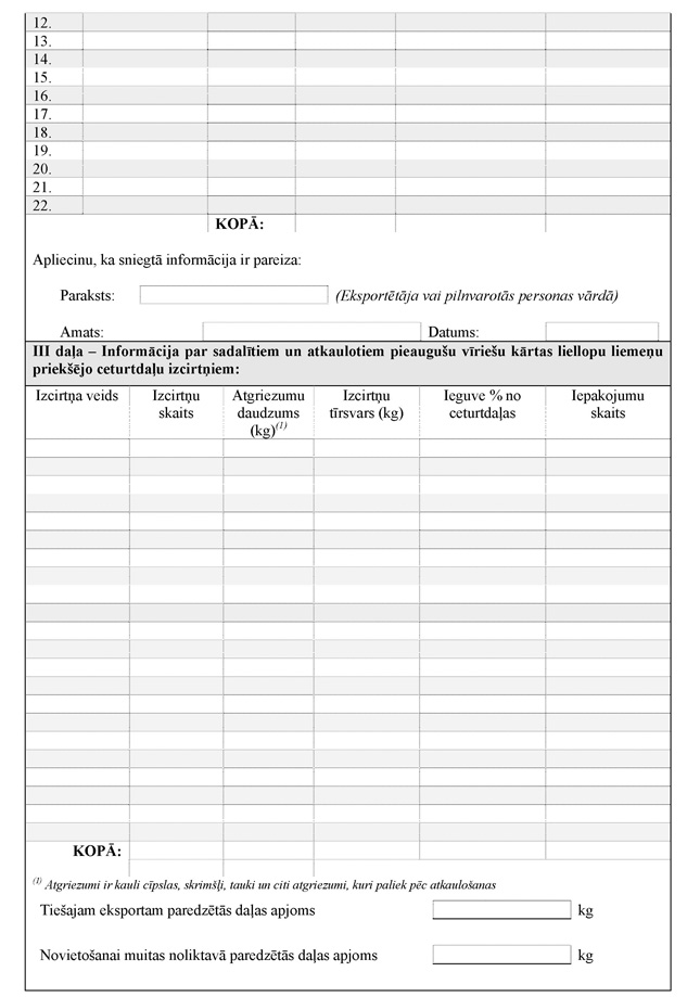 "93. Lai saņemtu atļauju neiesniegt Komisijas Regulas Nr.612/2009 17.pantā noteiktos galamērķa valsts pierādījuma dokumentus, persona iesniedz Lauku atbalsta dienestā iesniegumu, ar kuru apliecina eksportējamo pārstrādāto lauksaimniecības produktu atbilstību Komisijas Regulas Nr.1043/2005 54.panta 3.punkta "a" apakšpunktam un kurā par attiecīgo pārstrādāto lauksaimniecības produktu norāda:".