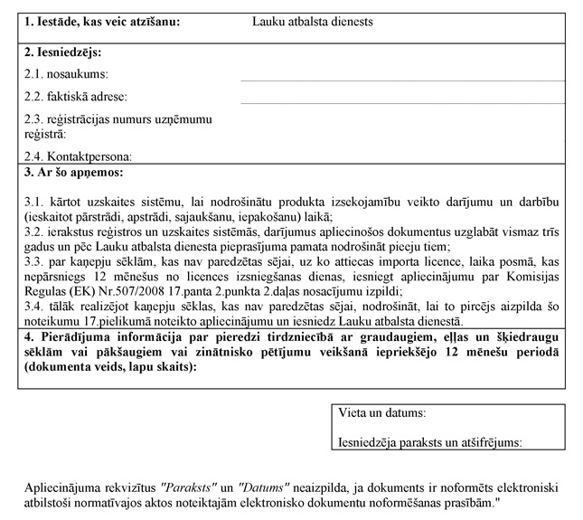 "106. Importētājs saskaņā ar Padomes Regulas Nr.1234/2007 130.pantu un 157.panta 2.punkta trešo daļu iesniedz Lauku atbalsta dienestā iesniegumu atzīta importētāja statusa iegūšanai to kaņepju sēklu importam, kas nav paredzētas sējai (15.pielikums). Iesniegumā importētājs apliecina, ka apņemas:".