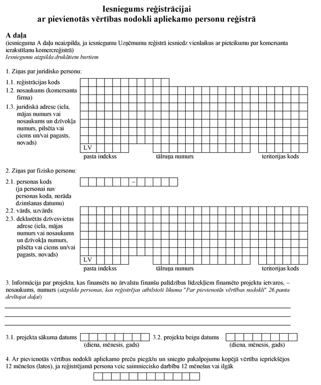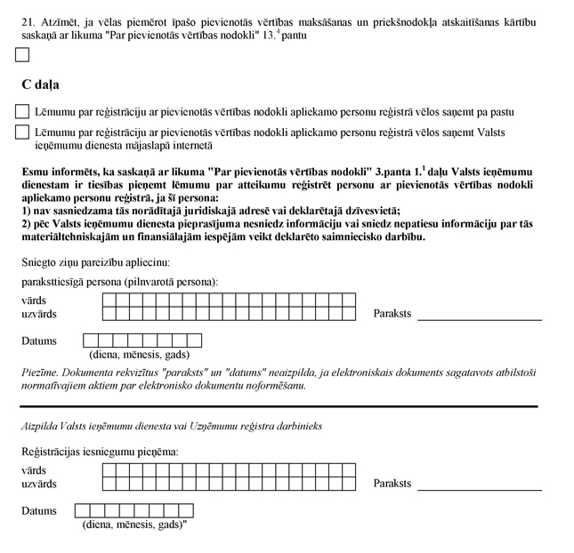 293.3 Saskaņā ar likuma 13.4 panta sesto daļu persona, kura vēlas piemērot likuma 13.4 pantā noteikto īpašo nodokļa maksāšanas un priekšnodokļa atskaitīšanas kārtību un informē par to Valsts ieņēmumu dienestu, iesniedzot reģistrācijas iesniegumu, atzīmē to reģistrācijas iesnieguma (1.pielikums) 21.punktā."