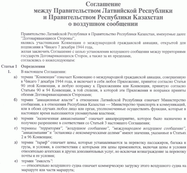Соглашение между Правительством Латвийской Республики и Правительством Республики Казахстан о воздушном сообшении. Publicēts oficiālajā laikrakstā "Latvijas Vēstnesis", 4.11.1998., Nr. 331/332 https://www.vestnesis.lv/ta/id/218685