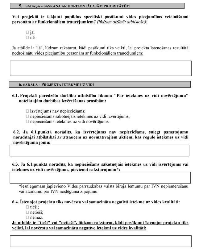 | Izstrādājot būvprojektu, tiks ņemtas vērā būvniecību reglamentējošajos normatīvajos aktos noteiktās prasības, bet projektā nav paredzēti specifiski pasākumi vides pieejamības veicināšanai personām ar funkcionāliem traucējumiem | 0 | ||