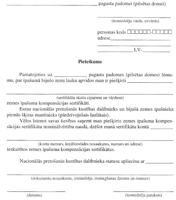 5. Lai dzēstu sertifikātus, saņemot kompensāciju naudā, nacionālās pretošanās kustības dalībniekiem līdz 1999.gada 30.jūnijam jāiesniedz pieteikums (1.pielikums) tajā pagasta vai pilsētas pašvaldībā, kuras teritorijā atrodas attiecīgais zemes īpašums.