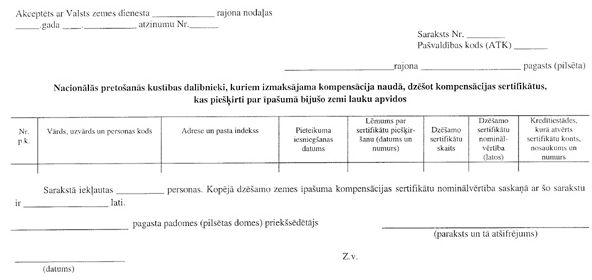 2. Tiesības dzēst sertifikātus, saņemot to nominālvērtību naudā (28 lati par vienu sertifikātu), ir nacionālās pretošanās kustības dalībniekiem, kuri kompensāciju par īpašumā bijušo zemi lauku apvidos pieprasījuši līdz 1992.gada 31.decembrim un ir bijušo zemes īpašnieku pirmās šķiras mantinieki vai bijušo zemes īpašnieku pārdzīvojušie laulātie.