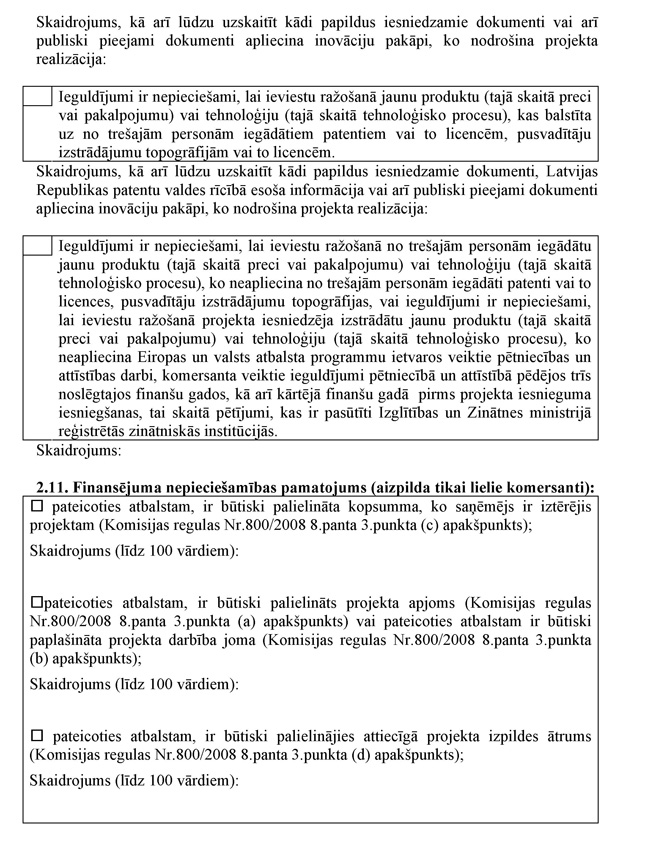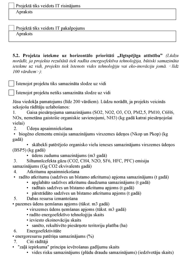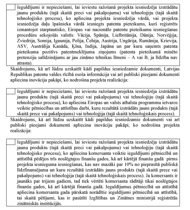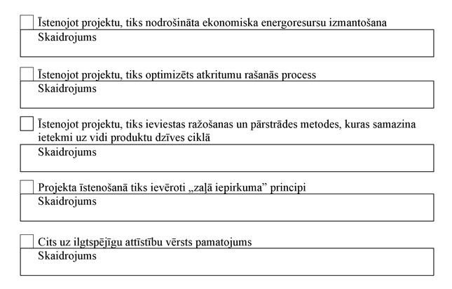 | 8.2. | Projekta rezultātā netiek radīta energoefektīvāka tehnoloģija, būtiski samazināta ietekme uz vidi, projekts netiek īstenots vides tehnoloģiju vai ekoinovāciju jomā |