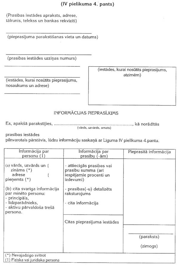 1. IV pielikuma 4.pantā minētais informācijas pieprasījums tiek noformēts rakstiski saskaņā ar II pielikuma paraugu. Minētajam pieprasījumam ir jābūt ar prasības iestādes oficiālo zīmogu un ar tās amatpersonas parakstu, kura ir pilnvarota iesniegt šādu pieprasījumu.