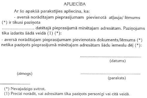 Atļaujas (vai lēmuma) divi eksemplāri, par kuru tiek pieprasīta paziņošana, tiek pievienoti iepriekšējā rindkopā minētajam pieprasījumam.