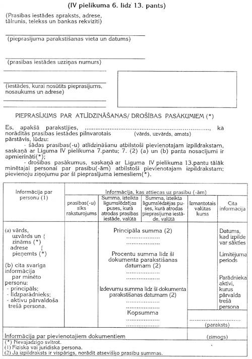 1. IV pielikuma 6. un 13.pantā minētais pieprasījums par atlīdzināšanu un/ vai drošības pasākumiem tiek noformēts rakstiski saskaņā ar 4. pielikuma paraugu. Pieprasījumam, kurā ir ietverta deklarācija, ka IV pielikumā noteiktie nosacījumi par savstarpējas palīdzības procedūras uzsākšanu konkrētajā gadījumā ir izpildīti, ir jābūt ar prasības iestādes oficiālo zīmogu un ar tās amatpersonas parakstu, kurš ir pilnvarots iesniegt šādu pieprasījumu.