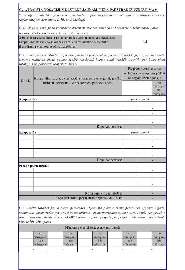 "4.3. juridiska persona piena pārstrādes sektorā, ja vismaz 51 procents tās daļas, akcijas vai pajas pieder vienam vai vairākiem atbilstīgiem kooperatīviem, bet pārējās daļas, akcijas vai pajas pieder arī vienai vai vairākām personām, kas nodarbojas ar piena ražošanu, vai vienam vai vairākiem kooperatīviem, kas apvieno piena ražotājus, un ja daļu, akciju vai paju īpašnieku kopējais piegādes kvotas ietvaros realizētais piena apjoms pēdējā noslēgtajā kvotas gadā ir vismaz 70 000 tonnu (nosakot realizēto piena apjomu kooperatīviem, vērā tiek ņemts to biedru piegādes kvotas ietvaros realizētais piena apjoms) (turpmāk – jauns piena pārstrādes uzņēmums)."
