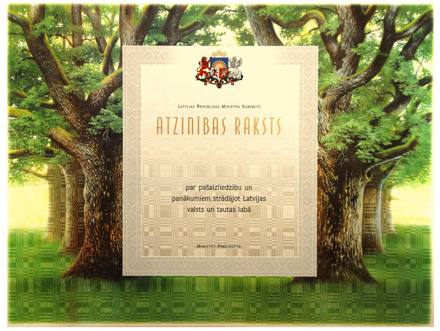 Atzinības raksta izmērs – 309 x 409 mm.
