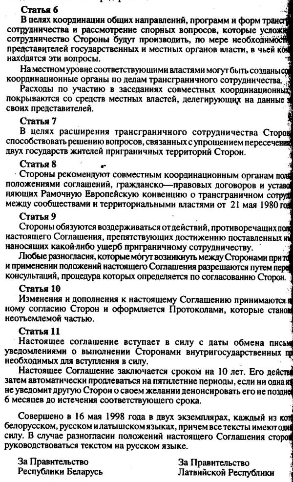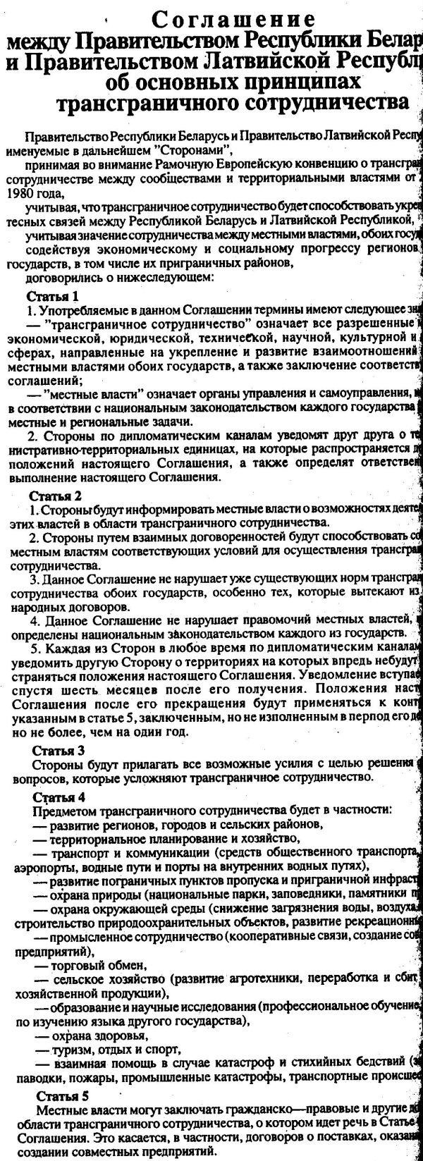 Соглашение между Правительством Республики Беларусь и Правительством Латвийской Республики об основных принципах трансграничного сотрудничества. Publicēts oficiālajā laikrakstā "Latvijas Vēstnesis", 28.07.1998., Nr. 219/220 https://www.vestnesis.lv/ta/id/219415