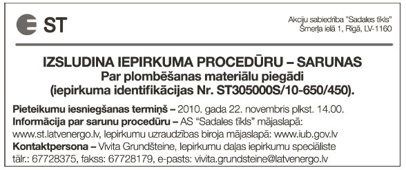 Konkursa piedāvājumu atvēršana notiks 2010.gada 1.decembrī plkst. 10.00 Rīgā, Gogoļa ielā 3, 227.kabinetā.