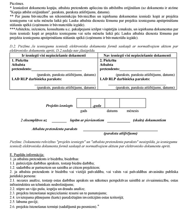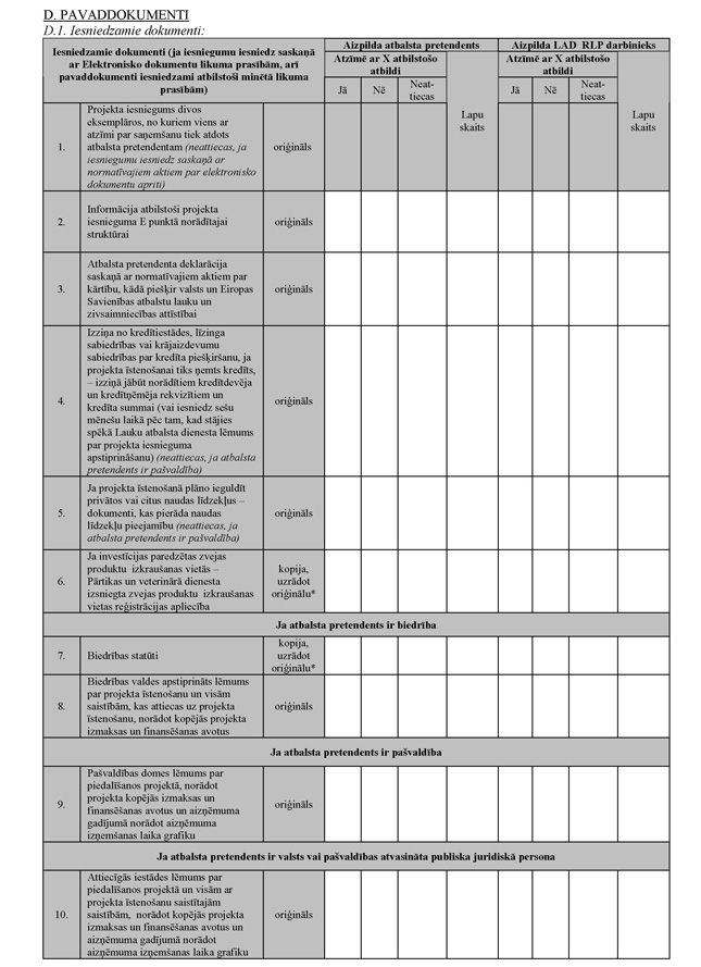 "10.2.1. projekta iesniegumu (1.pielikums) divos eksemplāros (vienu projekta iesnieguma eksemplāru atbalsta pretendents saņem atpakaļ ar Lauku atbalsta dienesta atzīmi par iesniegšanu (neattiecas, ja projekta iesniegumu iesniedz elektroniska dokumenta formā));".