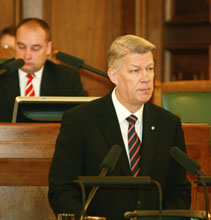9.Saeima ir beigusi savu darbu. Tai nācās strādāt ļoti sarežģītos ekonomiskos un politiskos apstākļos. Tāpēc vēlos pateikt paldies klātesošajiem 9.Saeimas deputātiem un 9.Saeimas priekšsēdētājam Gundaram Daudzes kungam par paveikto valsts ekonomiskās krīzes pārvarēšanā un Latvijas tautsaimniecības atveseļošanā. Pateikties par to, ka, neskatoties uz sarežģīto iekšpolitisko situāciju, spējāt vienoties un izpildīt 9.Saeimas vēsturisko misiju – nodrošināt būtisku lēmumu pieņemšanu valsts ekonomiskās situācijas stabilizācijai.
