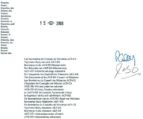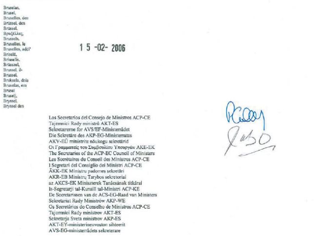 Šis susitarimas pateiktas pasirašyti 2005 m. birželio 25 d. Liuksemburge, o paskui, 2005 m. liepos 31 d.-2005 m. gruodžio 31 d., Europos Sąjungos Tarybos generaliniame sekretoriate Briuselyje.