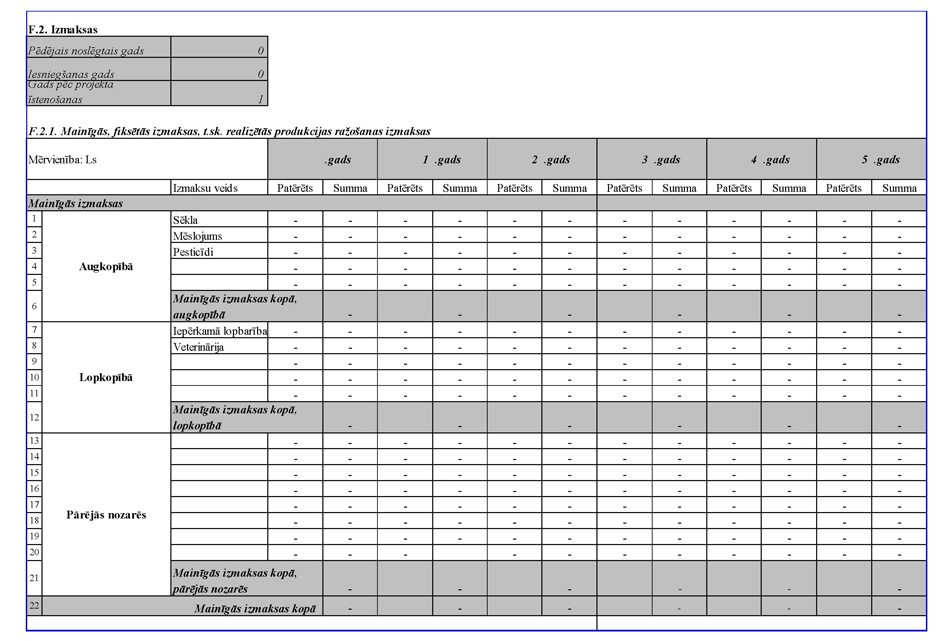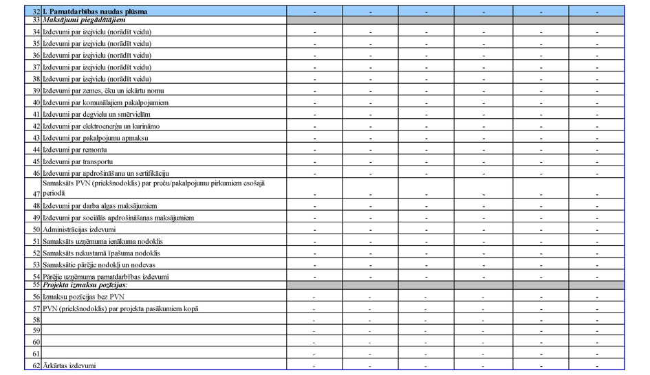 11.1. standartizētu biznesa plānu, kas ietver informāciju par ražošanas apjomu, izmaksām, pamatlīdzekļiem, kreditoriem, peļņas vai zaudējumu aprēķinu, bilanci par pēdējo noslēgto gadu, turpmākajiem gadiem līdz projekta īstenošanas beigām un gadu pēc projekta īstenošanas, kā arī naudas plūsmas pārskatu pa gadiem projekta iesnieguma iesniegšanas gadā, turpmākajos gados līdz projekta īstenošanas beigām un gadā pēc projekta īstenošanas. Naudas plūsmā naudas atlikumam katra gada beigās ir jābūt pozitīvam;