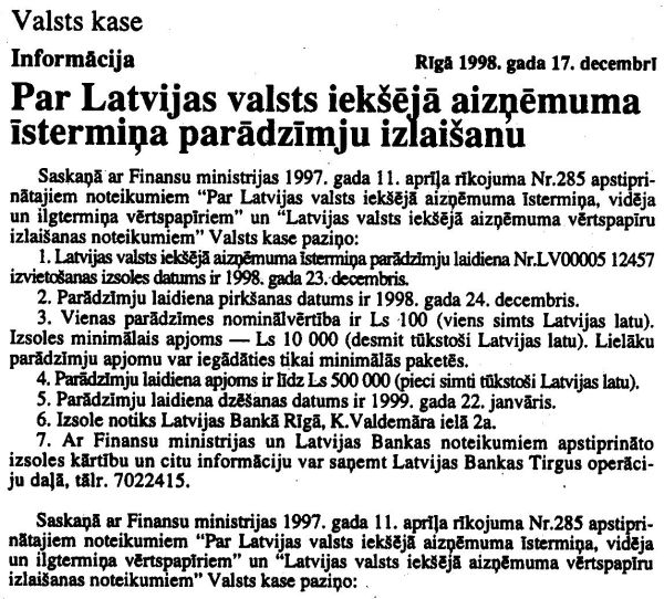 Par Latvijas valsts iekšējā aizņēmuma īstermiņa parādzīmju izlaišanu. Publicēts oficiālajā laikrakstā "Latvijas Vēstnesis", 18.12.1998., Nr. 375/380 https://www.vestnesis.lv/ta/id/220769