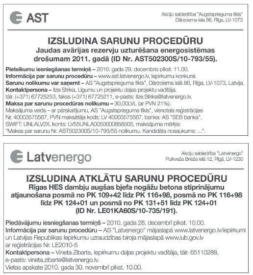 Piegādes un darbu izpildes pasūtījumi. Publicēts oficiālajā laikrakstā "Latvijas Vēstnesis", 17.11.2010., Nr. 183 https://www.vestnesis.lv/ta/id/221451