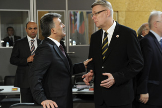 Protams, nākamais lielākais jautājums bija Afganistāna. Kā mēs zinām, pirms diviem gadiem Bukarestē šis arī bija viens no centrālajiem jautājumiem. Šeit ir klāt arī mūsu partnervalstis – visas, kas piedalās starptautiskajā misijā Afganistānā. Arī šeit gan NATO dalībvalstis, gan mūsu partneri apliecina, ka Afganistānā paliks līdz tam brīdim, kamēr mēs pilnībā varēsim nodot valsts kontroli un drošības kontroli afgāņu valstij, pašiem afgāņiem. Un šis process sāksies jau faktiski nākamgad. Protams, visi uzskata, ka civilā sadarbība ir viens no galvenajiem atslēgas vārdiem, lai sasniegtu panākumus Afganistānā. Protams, mēs runājām arī par to, un es īpaši uzsvēru to, ka mēs esam ieinteresēti dot savu ieguldījumu caur Ziemeļu transporta ceļu, turpināt šīs kravu piegādes, būt Afganistānā, neskatoties uz to, ka mums ir bijušas grūtības ar militārā budžeta finansēšanu, būt uzticīgiem partneriem. Tas arī no partneru puses tika augstu novērtēts.
