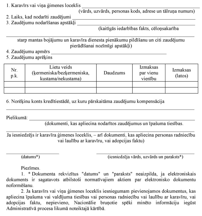 31. Lai saņemtu kompensāciju par zaudējumiem, kas nodarīti karavīra vai viņa ģimenes locekļa mantai sakarā ar dienesta pienākumu izpildi, karavīrs vai viņa ģimenes loceklis 12 mēnešu laikā pēc to nodarīšanas iesniedz Nacionālo bruņoto spēku komandierim rakstisku iesniegumu (3.pielikums).