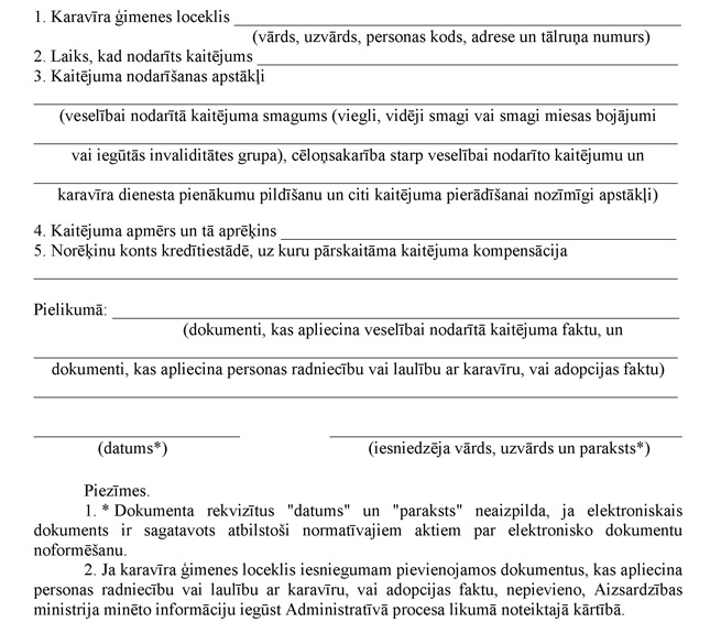 46. Lai saņemtu kompensāciju par karavīra ģimenes locekļa (vecāka, vecvecāka, bērna, mazbērna, adoptētā vai adoptētāja, brāļa, māsas vai laulātā) veselībai nodarīto kaitējumu, kas radies sakarā ar karavīra dienesta pienākumu izpildi, karavīra ģimenes loceklis 12 mēnešu laikā pēc tā nodarīšanas iesniedz Aizsardzības ministrijā rakstisku iesniegumu kompensācijas saņemšanai saistībā ar karavīra ģimenes locekļa veselībai nodarīto kaitējumu (4.pielikums).