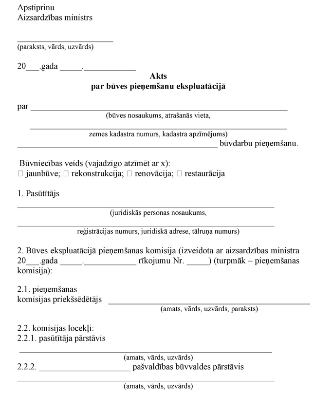 3.16 Pieņemšanas komisija sastāda un paraksta aktu par būves pieņemšanu ekspluatācijā (6.pielikums). Aktu apstiprina aizsardzības ministrs.