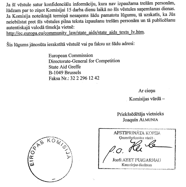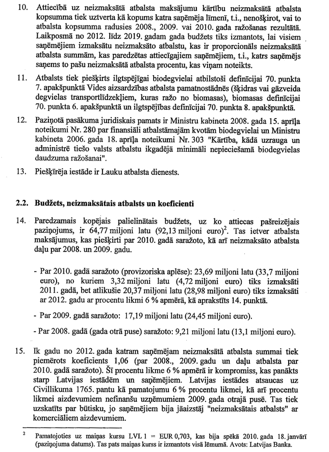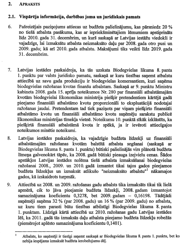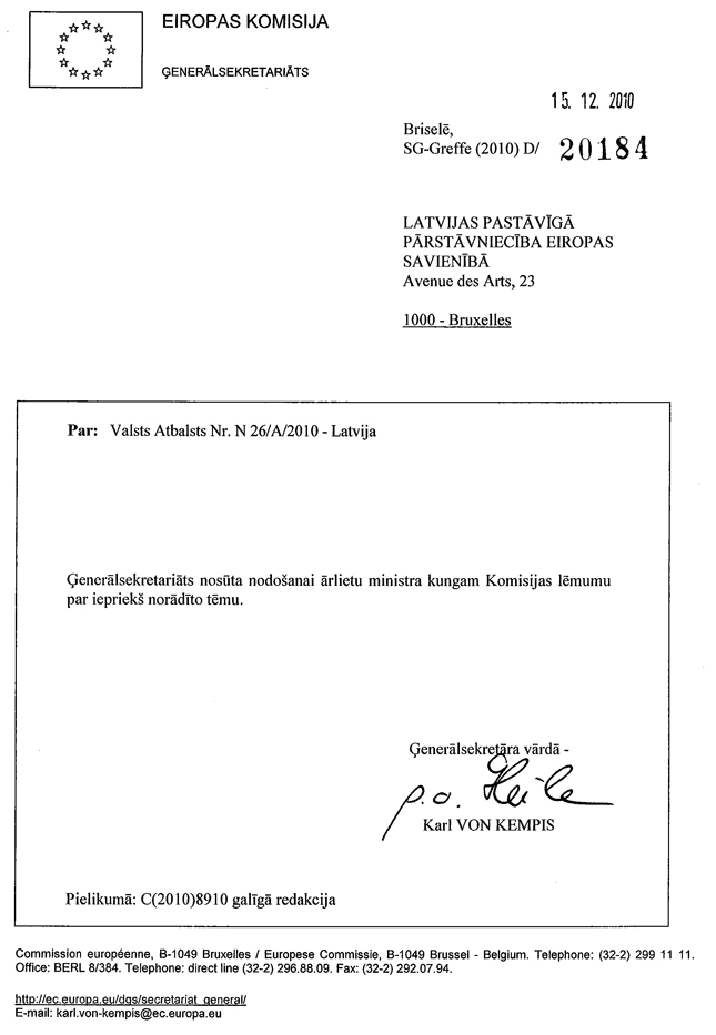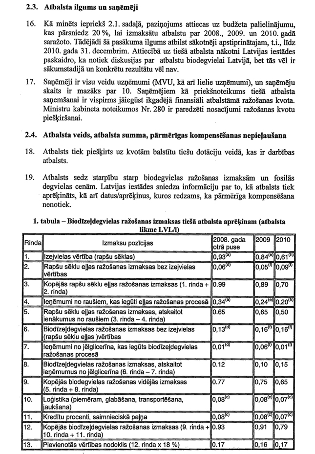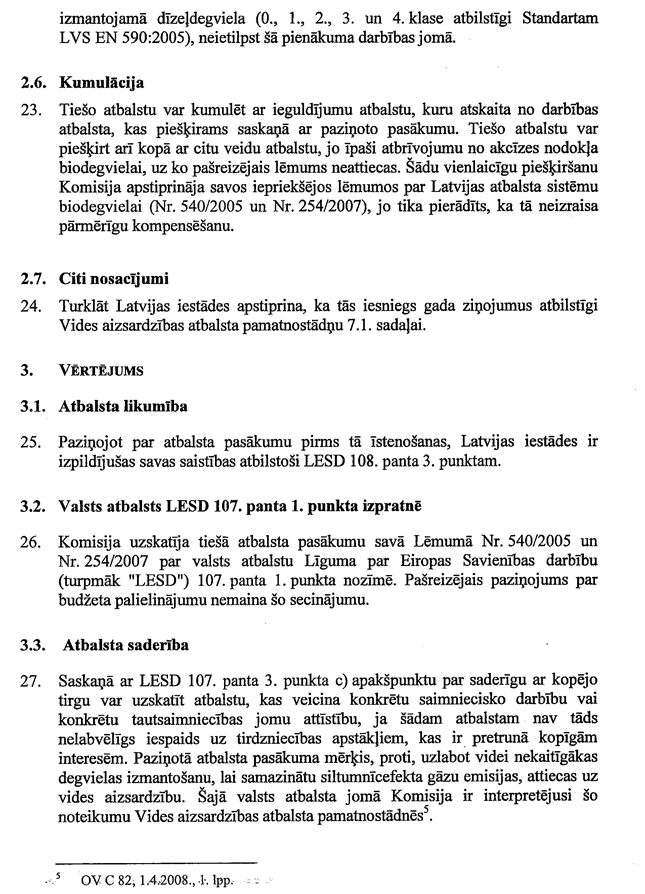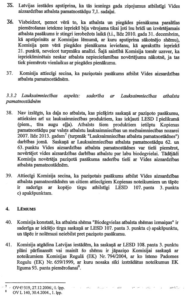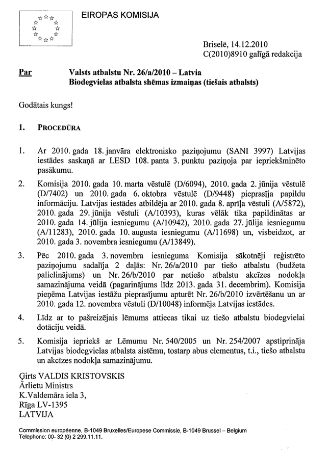 Informējam, ka Eiropas Komisijas lēmums par saderību ar kopējo tirgu atbalsta pasākumam biodegvielas ražotājiem pieņemts 2010.gada 15.decembrī Nr.26/a/2010 „Biodegvielas atbalsta shēmas izmaiņas (tiešais atbalsts)