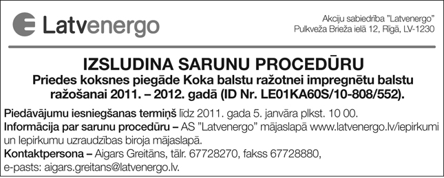 Piegādes un darbu izpildes pasūtījumi. Publicēts oficiālajā laikrakstā "Latvijas Vēstnesis", 21.12.2010., Nr. 201 https://www.vestnesis.lv/ta/id/223073