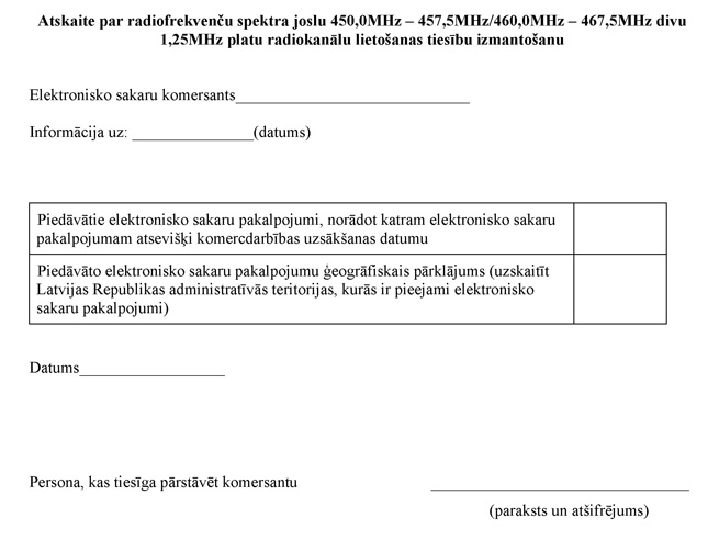 72. Izsoles uzvarētājs reizi gadā līdz 10.februārim par situāciju līdz 1.janvārim iesniedz Regulatoram atskaiti par radiofrekvenču spektra joslu 450,0MHz – 457,5MHz/460,0MHz – 467,5MHz divu 1,25MHz platu radiokanālu lietošanas tiesību izmantošanu (6.pielikums).