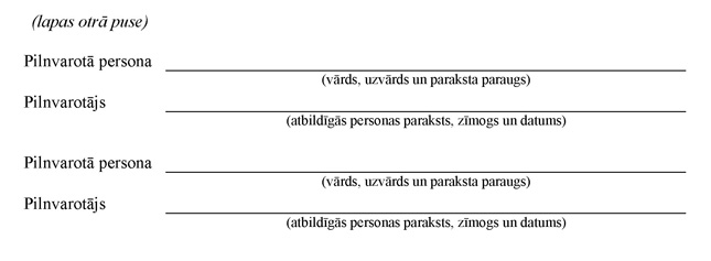 54. Atbildīgā persona var pilnvarot citu personu tās vārdā izmantot vispārējo galvojumu. Fiziskā persona pilnvaro tās vārdā izmantot vispārējo galvojumu ar notariālā kārtībā izdotu pilnvaru. Juridiska persona vispārējā galvojuma apliecības otrā pusē norāda personas, kuras pilnvarotas izmantot vispārējā galvojuma apliecību. Atbildīgajai personai ir tiesības izdarīt grozījumus pilnvaroto personu sarakstā. Katras pilnvarotās personas iecelšanu vai pilnvaru atsaukšanu atbildīgā persona apstiprina ar parakstu un zīmogu. Atbildīgā persona ir atbildīga par ierakstu patiesumu vispārējā galvojuma apliecībā.
