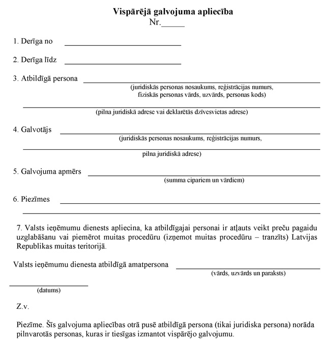57. Tikai atbildīgā persona vai tās pilnvarotā persona, kura norādīta vispārējā galvojuma kredītiestādes galvojuma vēstules (1.pielikums) vai galvojuma apdrošināšanas polises (2.pielikums) otrā pusē, ir tiesīga parakstīt muitas iestādē iesniegto muitas deklarāciju vai iesniegt pirmsmuitošanas dokumentu.