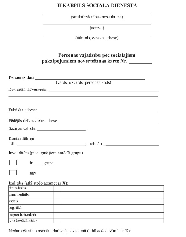 11.2. novērtē personas vajadzības pēc pieprasītā pakalpojuma, aizpildot Personas vajadzību pēc sociālajiem pakalpojumiem novērtēšanas karti (2.pielikums), kurā izvērtē vajadzību pēc sociālajiem pakalpojumiem, un norāda datus par personu un tās ģimeni, dzīves apstākļiem, personas resursu un pašaprūpes novērtējumu, kā arī nepieciešamo sociālā pakalpojuma veidu un pakalpojuma saņemšanas ilgumu, ja persona pieprasījusi šo noteikumu 5.punktā neminētu pašvaldības nodrošinātu sociālo pakalpojumu;