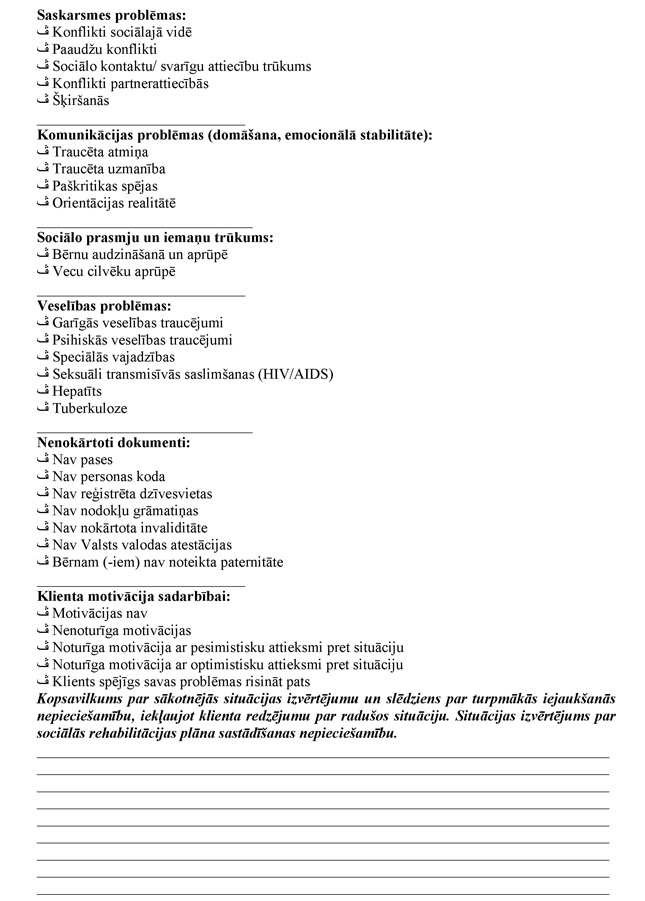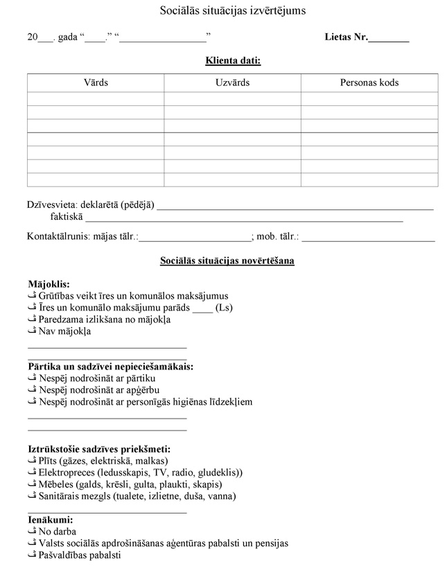 11.4. nepieciešamības gadījumā izvērtē personas sociālo situāciju un vienojas ar viņu par turpmāk sniedzamajiem sociālajiem pakalpojumiem, ja tie būtu vajadzīgi (4.pielikums);
