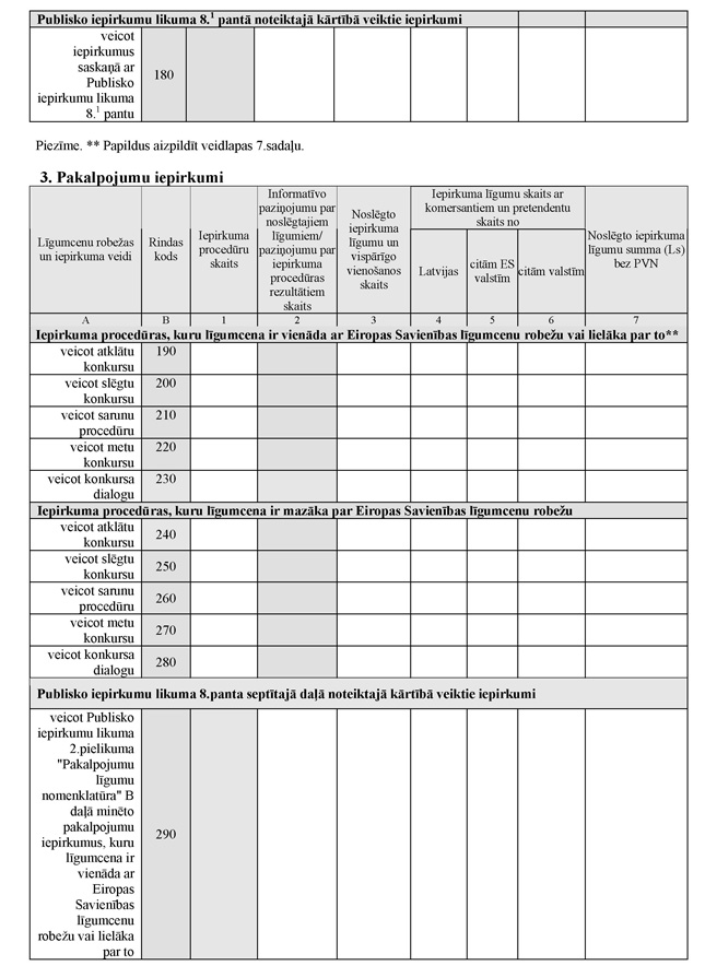 28. Aizpildot kādu no 190.rindas līdz 280.rindai, obligāti jāaizpilda ailes "Iepirkuma procedūru skaits", "Noslēgto iepirkuma līgumu un vispārīgo vienošanos skaits", aiļu grupa "Iepirkuma līgumu skaits ar komersantiem un pretendentu skaits no" un aile "Noslēgto iepirkuma līgumu summa (Ls) bez PVN".