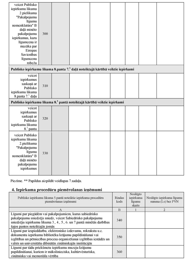 29. 290., 300. un 330.rindā norāda Publisko iepirkumu likuma 2.pielikuma "Pakalpojumu līgumu nomenklatūra" B daļā minēto pakalpojumu iepirkumus, kurus īstenojot iepriekšējā kalendāra gadā noslēgti pakalpojumu iepirkuma līgumi, tos grupējot pēc līgumcenas.
