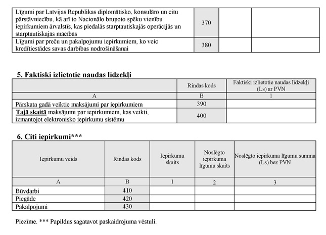 38. 370.rindas "Noslēgto iepirkuma līgumu skaits" un "Noslēgto iepirkuma līgumu summa (Ls) bez PVN" aizpilda, ja iepirkuma līgumi noslēgti par Latvijas Republikas diplomātisko, konsulāro un citu pārstāvniecību, kā arī to Nacionālo bruņoto spēku vienību iepirkumiem ārvalstīs, kuras piedalās starptautiskajās operācijās un starptautiskajās mācībās.