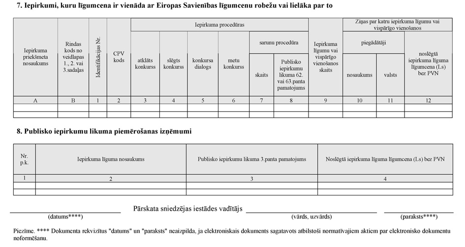 55. Veidlapas 8.sadaļā norāda iepirkuma līgumus, kuri iepriekšējā kalendāra gadā noslēgti, pamatojoties uz Publisko iepirkumu likuma 3.pantā noteiktajiem likuma piemērošanas izņēmumiem. Par katru noslēgto iepirkuma līgumu aizpilda atsevišķu rindu.
