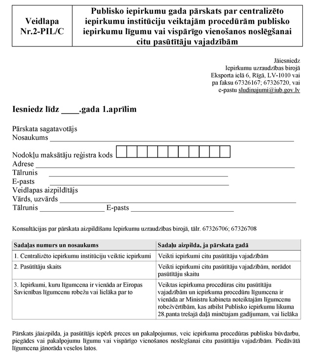 2.2. veidlapa Nr.2-PIL/C "Publisko iepirkumu gada pārskats par centralizēto iepirkumu institūciju veiktajām procedūrām publisko iepirkumu līgumu vai vispārīgo vienošanos noslēgšanai citu pasūtītāju vajadzībām" (turpmāk – veidlapa Nr.2-PIL/C) (2.pielikums).