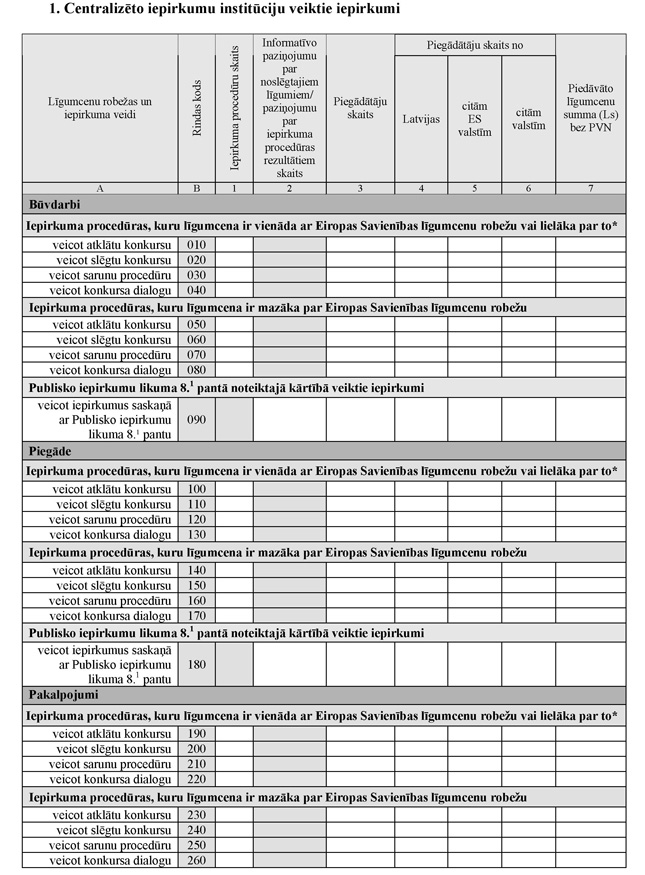 64. No 010.rindas līdz 080.rindai norāda būvdarbu iepirkumus, kuriem centralizēto iepirkumu institūcija ir piemērojusi iepirkuma procedūras un par kuriem Iepirkumu uzraudzības biroja mājaslapā internetā iepriekšējā kalendāra gadā ir publicēti paziņojumi par iepirkuma procedūras rezultātiem. Būvdarbu iepirkumus grupē pēc līgumcenas un piemērotās iepirkuma procedūras.