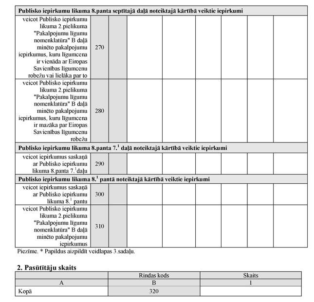 32. Ja pasūtītājs ir noslēdzis vienu vai vairākus pakalpojumu iepirkuma līgumus, veicot iepirkumus saskaņā ar Publisko iepirkumu likuma 8.1 pantu, aizpilda 320. un 330.rindu. Attiecīgo rindu aizpilda par visiem viena veida iepirkuma procedūras ietvaros noslēgtajiem iepirkuma līgumiem kopā.