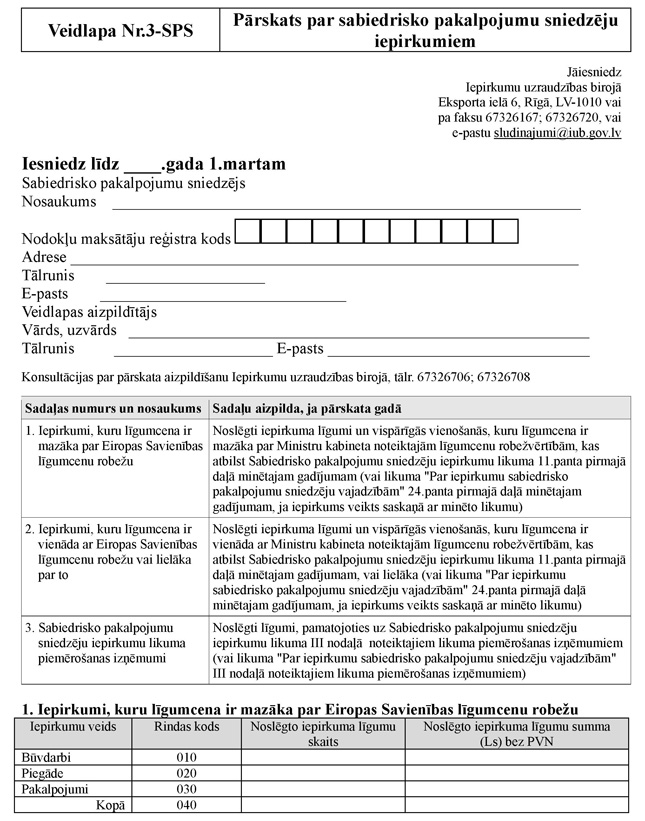 93. Veidlapā Nr.3-SPS iekļaujamā informācija sniedzama, pamatojoties uz Valsts statistikas likumu, Sabiedrisko pakalpojumu sniedzēju iepirkumu likumu, Ministru kabineta noteikumiem par valsts statistiskās informācijas programmu kārtējam gadam un Eiropas Savienības informācijas pieprasījumu.