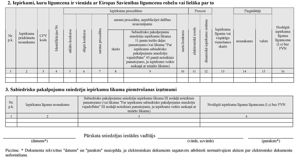 47. Aizpildot veidlapas Nr.1-PIL 7.sadaļu, norāda iepirkumus, kurus īstenojot iepriekšējā kalendāra gadā noslēgti piegāžu, pakalpojumu un būvdarbu iepirkuma līgumi un vispārīgās vienošanās un kuru līgumcena attiecīgi ir vienāda ar Ministru kabineta noteiktajām līgumcenu robežvērtībām, kas atbilst Publisko iepirkumu likuma 28.panta trešajā daļā minētajam gadījumam, vai lielāka.