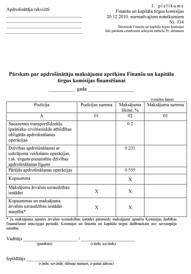 7.1. apdrošinātājiem "Pārskats par apdrošinātāju maksājumu aprēķinu Finanšu un kapitāla tirgus komisijas finansēšanai" (1. pielikums);