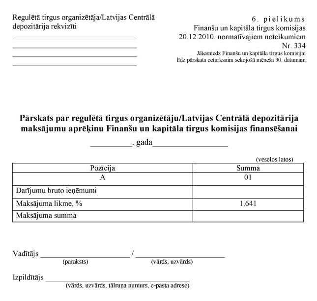 7.6. regulētā tirgus organizētājiem un Latvijas Centrālajam depozitārijam "Pārskats par regulētā tirgus organizētāju/Latvijas Centrālā depozitārija maksājumu aprēķinu Finanšu un kapitāla tirgus komisijas finansēšanai" (6. pielikums);