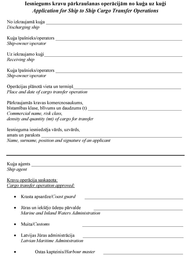 27. Ja jūrā tiek plānota kravu pārkraušana no kuģa uz kuģi, operācijā iesaistīto kuģu īpašnieki, operatori, fraktētāji vai to aģenti ne vēlāk kā septiņas dienas pirms plānotās operācijas iesniedz tuvākās ostas kapteinim noteikta parauga iesniegumu (1.pielikums), kas saskaņots ar Krasta apsardzi, Valsts vides dienesta Jūras un iekšējo ūdeņu pārvaldi, attiecīgo muitas iestādi un Jūras administrācijas Kuģošanas drošības departamentu.
