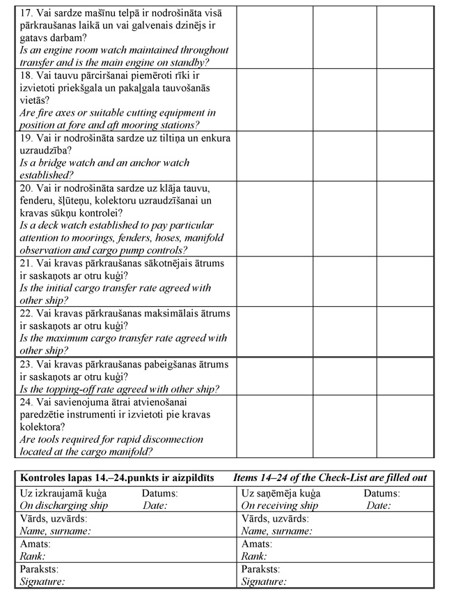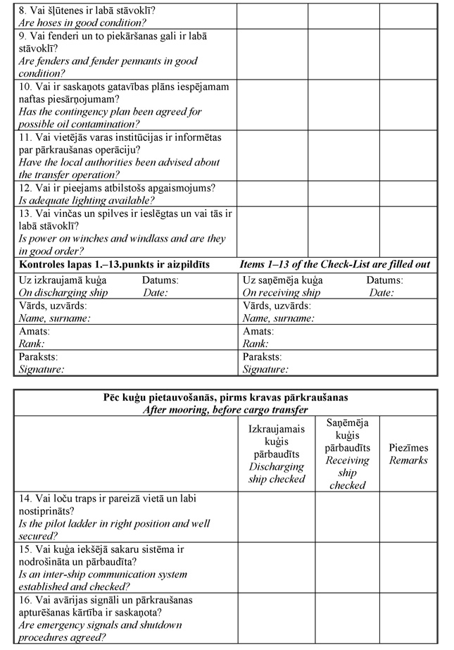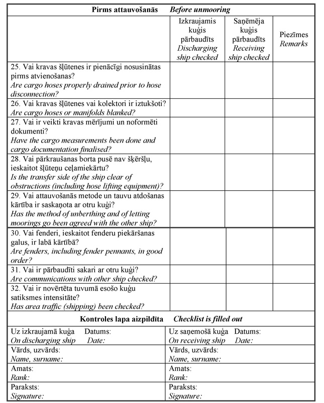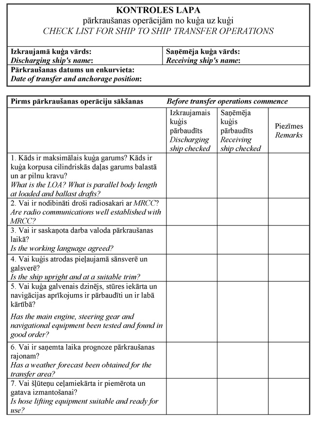 30. Veicot bīstamo un piesārņojošo kravu pārkraušanas operācijas, abi kravas pārkraušanas operācijā iesaistītie kuģi aizpilda kontroles lapu (2.pielikums) un ievēro normatīvajos aktos par jūrlietu pārvaldi un jūras drošību noteiktās prasības attiecībā uz operācijām ar bīstamām un piesārņojošām kravām.