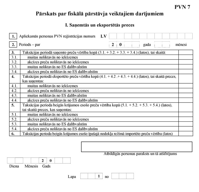 36.1 1. "I. Saņemtās un eksportētās preces" (turpmāk – PVN 7 pārskata I daļa). To aizpildot, fiskālais pārstāvis norāda taksācijas periodā Eiropas Savienības teritorijā veikto preču iegāžu vērtību likuma 1.panta 41.punkta "d" apakšpunktā minēto darījumu nodrošināšanai, to preču vērtību, kas saņemtas iekšzemē likuma 1.panta 41.punkta "c" apakšpunktā minēto darījumu nodrošināšanai, taksācijas periodā eksportēto preču vērtību un taksācijas perioda beigās krājumos esošo preču vērtību;