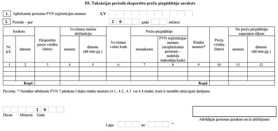 36.1 3. "III. Taksācijas periodā eksportēto preču piegādātāju saraksts" (turpmāk – PVN 7 pārskata III daļa). To aizpildot, fiskālais pārstāvis norāda taksācijas periodā eksportēto preču vērtību, norādot šo preču piegādātājus.
